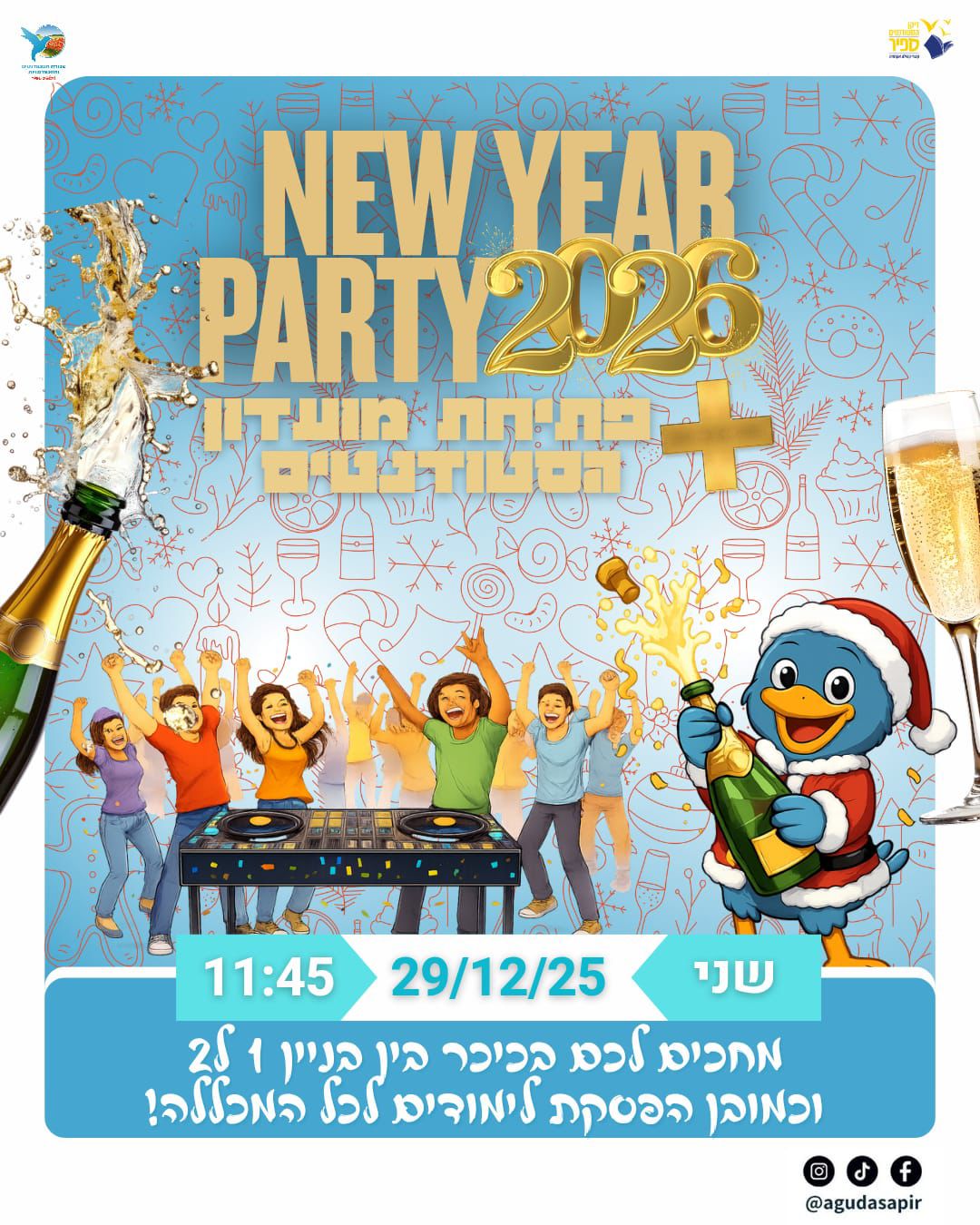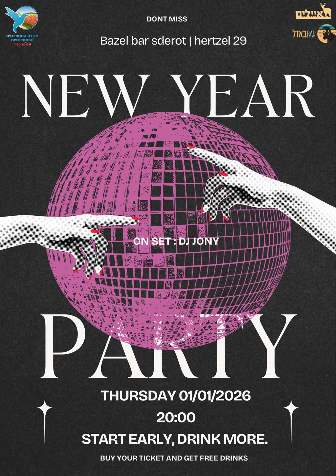 ואם בכל זאת לא הצלחנו לשכנע אתכם, ותעדיפו להישאר בערב הסילבסטר תחת הפוך ומול הנטפליקס – אגודת הסטודנטים של מכללת ספיר ארגנה אירוע קליל כדי להרים כוסית ולהתחיל את השנה האזרחית ברגל ימין. בתוכנית: הפסקת לימודים, דיג’יי בכיכר קולנוע והנדסאים (בין בניין 1 לבניין 2) ואלכוהול.