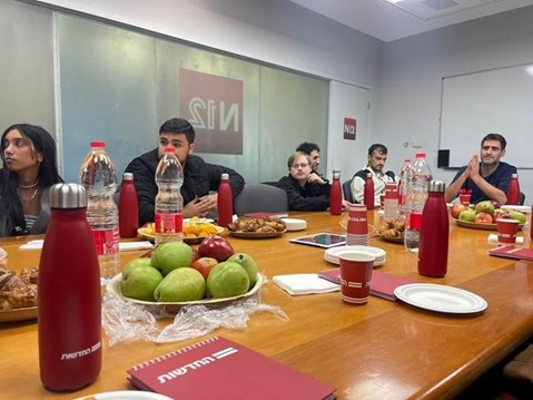 הקבוצה פגשה גם את ניר דבורי, שסיפר על הספר החדש שהוציא, על בוקר ה-7/10 שלו ככתב הצבאי של הערוץ ועל המתח הקיים בין מהירות לאמינות בחדשות. הסטודנטים ביקרו בדסק החוץ ודיברו עם הכתב טל שגיא, שבין סיקור ההפגנות באיראן לאירועים בוונצואלה, סיפר על האתגרים בעבודה, מה נדרש מכתב חוץ ולמה, לטענתו, מדובר ב”דסק המעניין ביותר”.