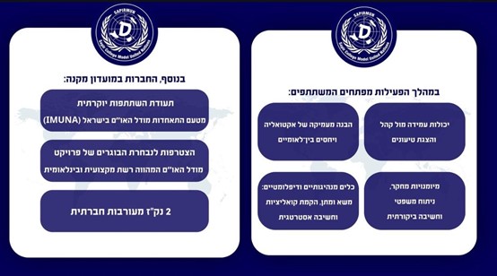במסגרת הפעילות מדמים הסטודנטים את עבודת ארגון האו”ם הלכה למעשה: הם משתתפים בסימולציות של דיונים רשמיים בנושאים כמו ביטחון, זכויות אדם וסוגיות חברתיות־כלכליות, לומדים את כללי הדיון ונהלי הארגון, ומייצגים מדינות שונות בזירה מדינית מדומה. המועדון מציע גם הכשרות מעשיות, הרצאות, סיורים וכנסים בארץ ובעולם, תוך עבודה משותפת עם סטודנטים ממדינות שונות וחשיפה לשיח גלובלי ממשי.
